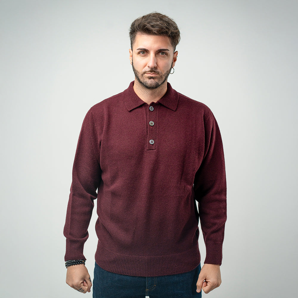 Polo In Lana Amaranto 3 Bottoni con Polsini e Cannolè a Coste